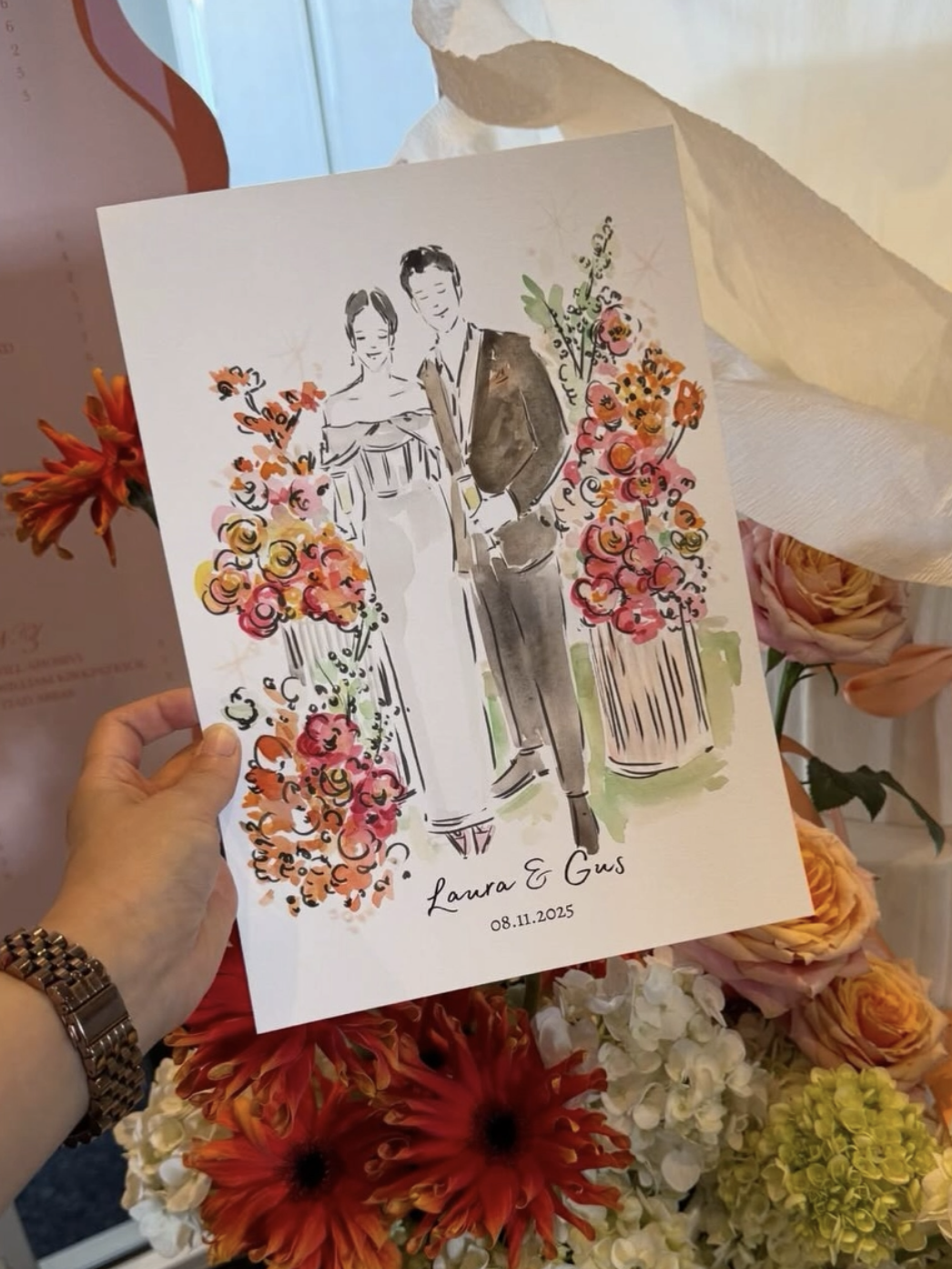 Throughout the evening, I created live illustrated guest portraits, capturing couples and friends in real time as part of the celebration.